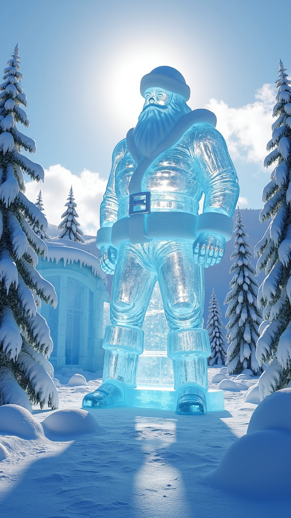 Create a breathtaking 8k hyper-realistic image of a mesmerizing world crafted entirely from ice, where every element is a stunning ice sculpture and a testament to pure ice artistry. In this frozen wonderland, ice characters, intricate ice buildings, and delicate ice plants and trees populate the scene, each glistening with ethereal clarity. At the heart of this glittering realm stands an impressive, crystal-clear ice sculpture of Santa Claus, its detailed features capturing the spirit of the season. Sunlight streams through the transparent ice, casting a dazzling array of rainbow reflections that dance across the icy surfaces, enhancing the magical ambiance of this wintry paradise.
