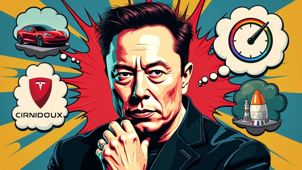 Create a striking and bold image of Elon Musk deep in thought, portrayed in a Neo-Pop Art style. Capture his facial expression as he contemplates innovative ideas, surrounded by symbols of his various ventures, including Tesla, SpaceX, Neuralink, and the Boring Company. Utilize a bright and saturated color palette, featuring vivid shades of red, blue, yellow, and green, with bold black outlines, characteristic of Neo-Pop Art. Incorporate elements of collage, blending photographs, text, and graphic designs to craft a visually arresting composition that embodies the dynamic energy of Elon Musk's entrepreneurial spirit. Frame the image to emphasize his central role, with symbols and elements artistically radiating outward from his thoughtful expression, and introduce subtle, creative adjustments while maintaining the core vision.