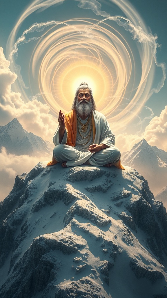 Create a hyper realistic 128k photorealistic image of a historical figure, seated in meditation atop a mountain. Render them with a majestic presence, with their aura open and glowing with divine energy. Surround them with swirling clouds and snow-capped peaks, emphasizing the serene yet powerful atmosphere of the scene. Capture the essence of divine energy and strength, conveying their role as one commanding cosmic forces. The image should evoke a sense of reverence and awe, portraying this figure as a supreme entity ruling over a sacred realm.