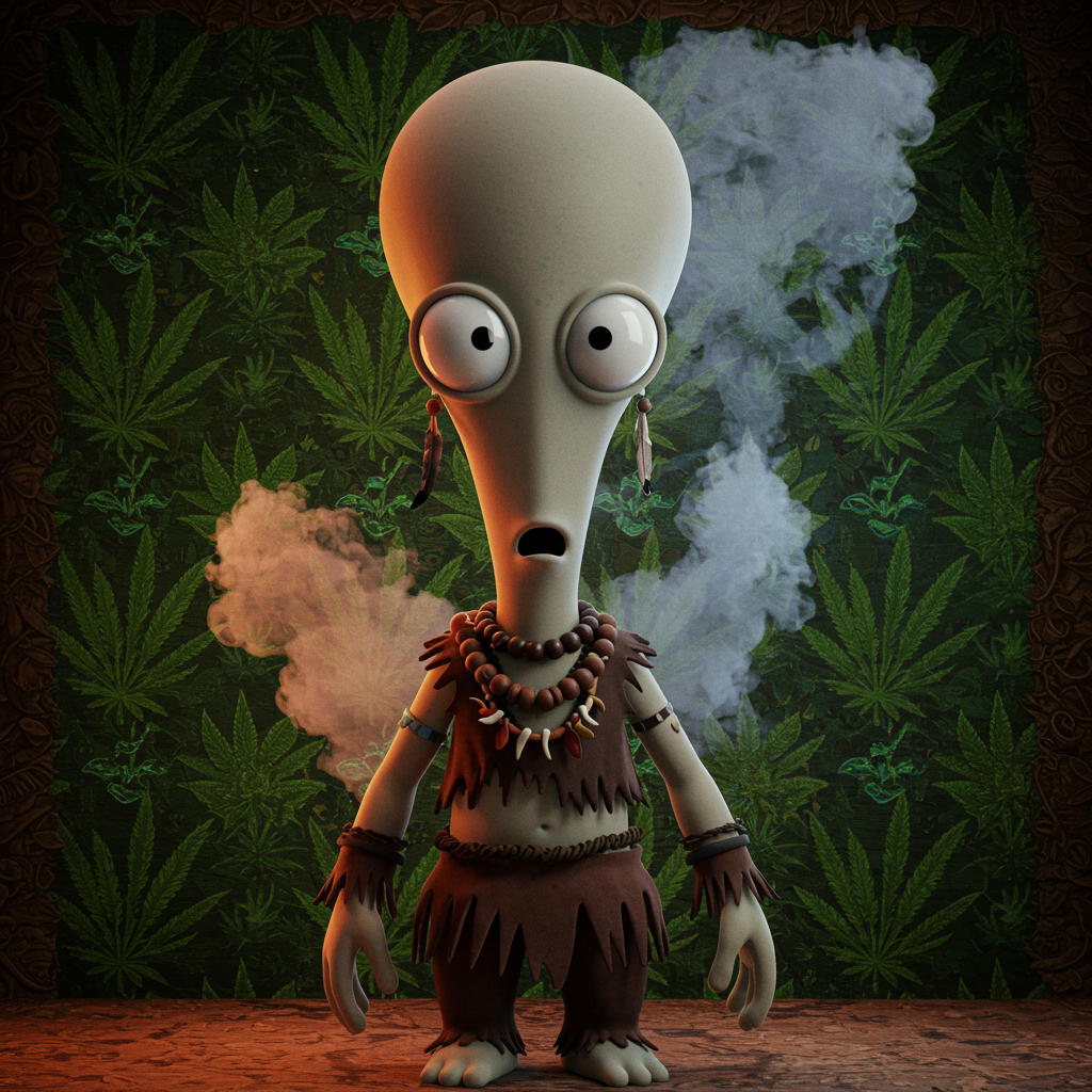 View this AI-generated image featuring create an intricate and realistic 3d rendering featuring roger smith from american dad depicted as an alien in a captivating scene the background is a richly detailed voodoo inspired tapestry intricately woven with patterns of vibrant green marijuana leaves int