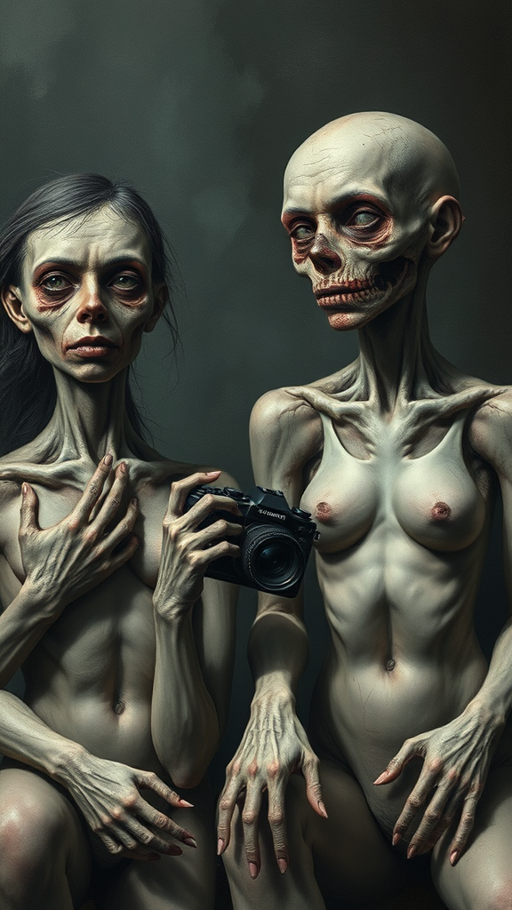 Created with inspiration from Tanya Shatseva, this artwork embodies a dark and psychopathic essence, capturing a gloomy, mad atmosphere. The scene is intentionally crafted with low quality, showcasing jpeg artifacts that contribute to an ugly, morbid style. Figures appear with duplicate features, portraying mutilated forms with poorly drawn hands and faces. Mutation manifests through deformed, blurry appearances, as dehydrated expressions reflect bad anatomy and proportions. Extra limbs and cloned faces distort reality, adding disfigured, gross proportions to the narrative. Malformed limbs, missing and extra limbs, and elongated necks further the surreal imagery. Elements such as cameras, names, signatures, watermarks, logos, autographs, and trademarks intrude, creating a sense of disarray. Body parts are cut off or censored, emphasizing bad anatomy and body structure, with deformities and unsettling features adding to the overall chaotic vision.