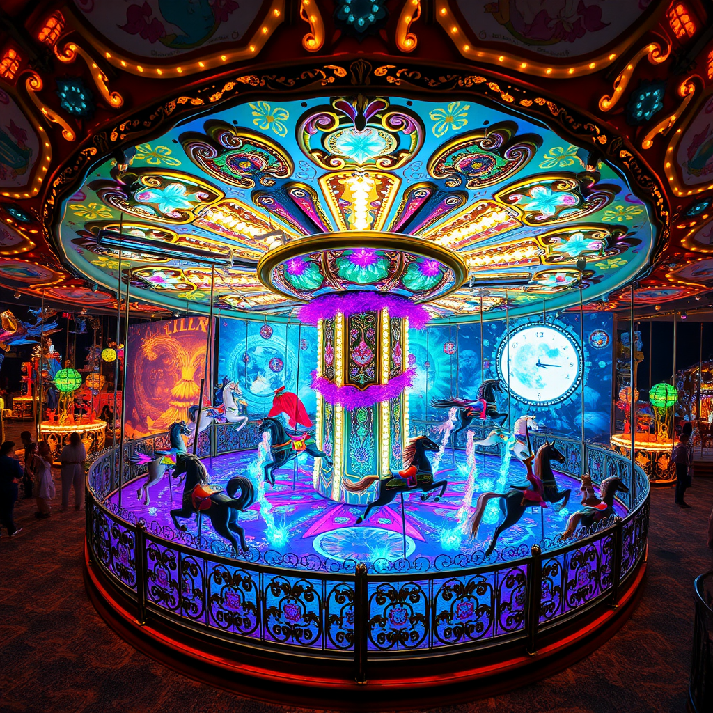 Creating a labyrinth of spinning worlds, each carousel reveals portals to diverse dimensions, where fantasy creatures ride in luminous harmony and time loops in vibrant, kaleidoscopic cycles.