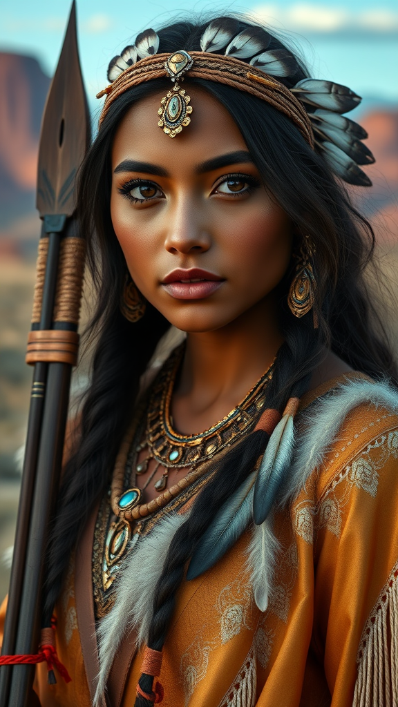 Creating a stunning portrait of Madison Beer as a Pocahontas-inspired character, this depiction showcases a young, beautiful Native American woman with a perfectly symmetrical face. She adorns herself with intricate feather jewelry and a traditional handmade dress, embodying the essence of an armed female hunter warrior. Set against a breathtaking Utah landscape, the scene boasts ultra-realistic detail and is crafted with the elegance of concept art, evoking the styles of renowned artists Artgerm, Greg Rutkowski, and Alphonse Mucha. The composition features a depth of field that highlights her striking dark face against contrasting elements like white fur and shimmering gold fabric. Though inspired by Pocahontas, the portrait is a unique creation—capturing the spirit of strength and elegance without deformed or additional features, maintaining a singular focus on this powerful individual.