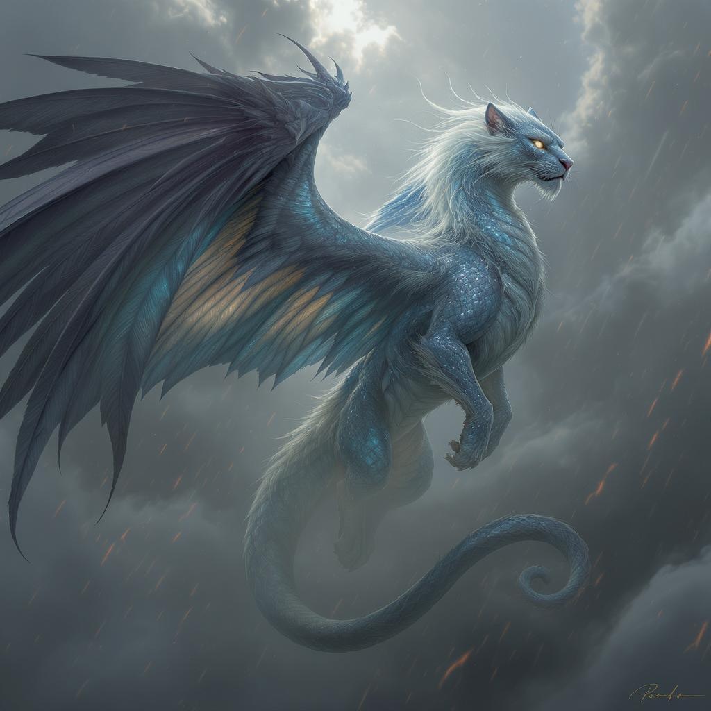 A majestic creature emerges from the mists, combining the grace of a human's expressive eyes and dexterous hands with the swift, elegant body of a panther. Its skin shimmers like the scales of a dragon, iridescent in the moonlight, and its voice carries the enchanting melody of an ancient myth. Feathered wings, grand and powerful, arc from its back, allowing it to glide silently across the sky, while its tail, a serpent's length, dances with the wisdom of ages, speaking to those who listen of forgotten realms and untold wonders.