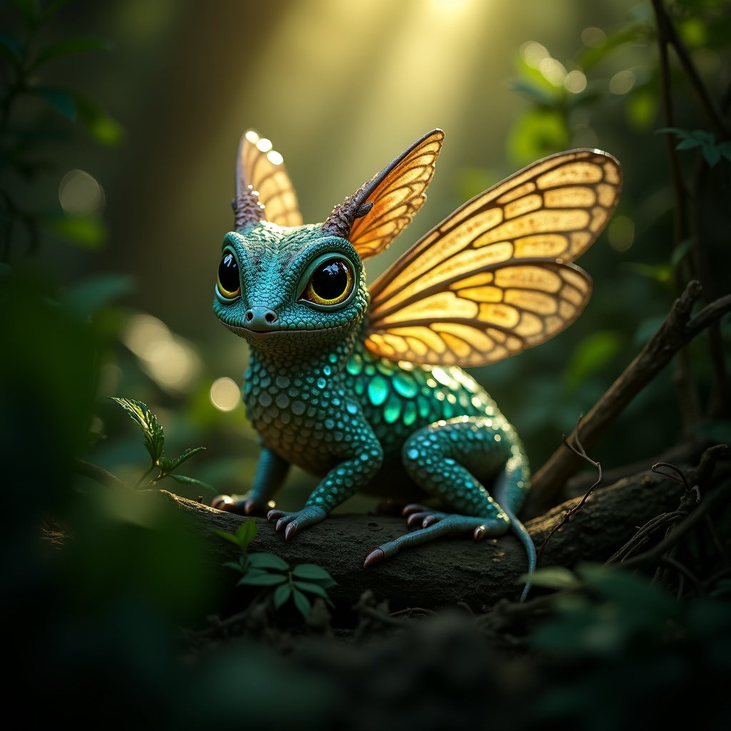 View this AI-generated image featuring a mystical creature nestled within the jungle its scales glistening with iridescent hues under the dappled fairy lighting ultra detailed features capture the essence of an ancient spirit with ethereal eyes and delicate luminescent wings rich vibrant colors meld