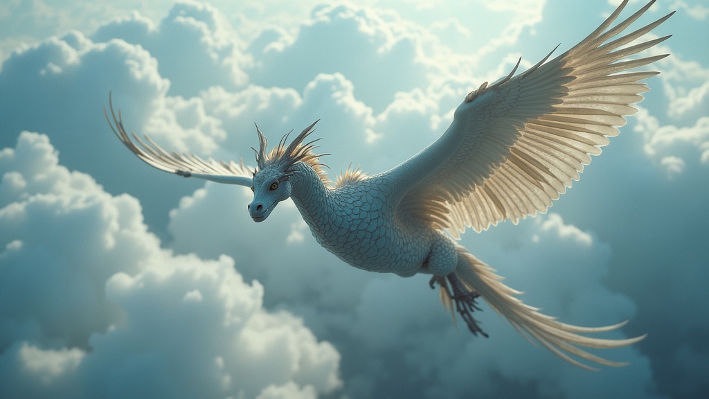 A majestic creature soaring gracefully through a sea of clouds, its elegant form reminiscent of mythical tales, intricate patterns adorning its body in a breathtaking display, captured in an expansive wide-angle view with dramatic cinematic lighting enhancing its ethereal allure.