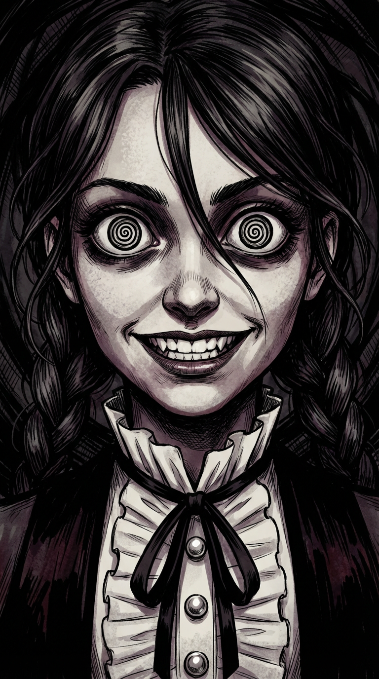 Close-up portrait of a creepy, smiling anime girl with large, wide-open eyes featuring black and white spirals for pupils. Her long black hair frames her face, with thin strands falling over her forehead and braids visible on the sides. She wears a white ruffled blouse with a black bow tie and metallic, circular buttons. The art style is a blend of digital art and anime with strong line work and textured shading, reminiscent of a detailed comic book. Dramatic, high-contrast lighting casts deep shadows under her eyebrows and chin, highlighting her sharp teeth. The mood is unsettling and intense. Colors are primarily muted, with dark blacks, whites, and subtle hints of red and purple in the shadows. The atmosphere is eerie and mysterious.