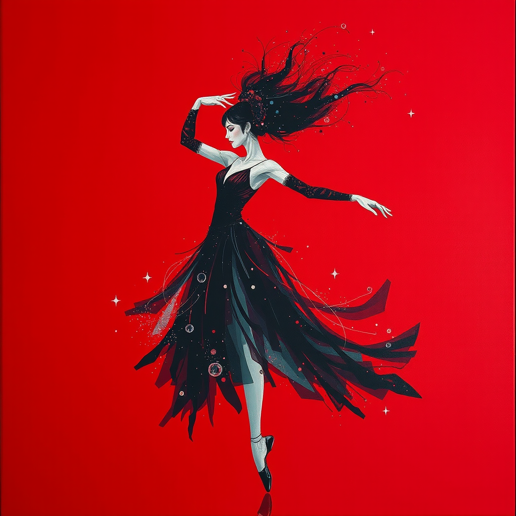 Crimson canvas featuring an abstract, digital ballerina adorned in midnight attire, pixels swirling around her in a geometric dance.