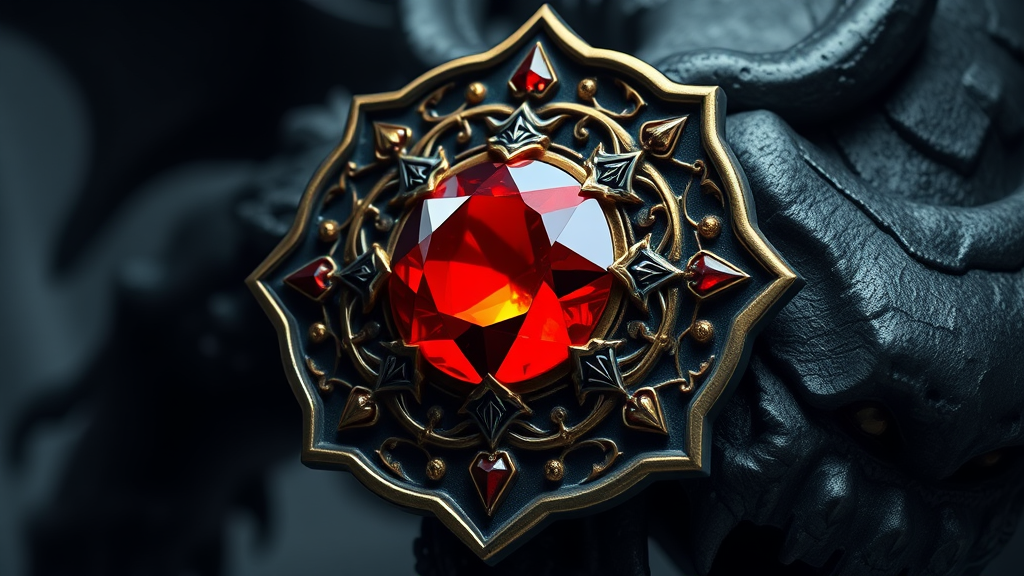 Crimson Gem Emblem, mystical artifact, gilded ornamentation, argent accents, shadowy mythical, round design.