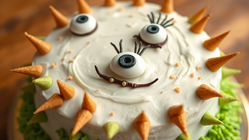 Critter-themed cake adorned with edible spikes and mischievous eyes, mimicking the playful chaos of the movie's creatures.