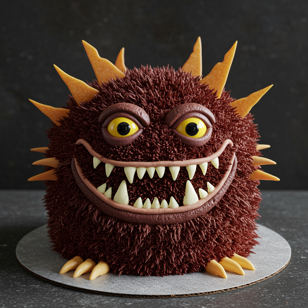 Critter-themed cake inspired by the mischievous and fuzzy creatures from the movie, featuring layers of dark chocolate with hints of red velvet, adorned with intricate frosting depicting sharp-toothed grins and googly-eyed expressions, topped with edible spikes and sugar-crafted talons for a whimsical yet slightly eerie touch.