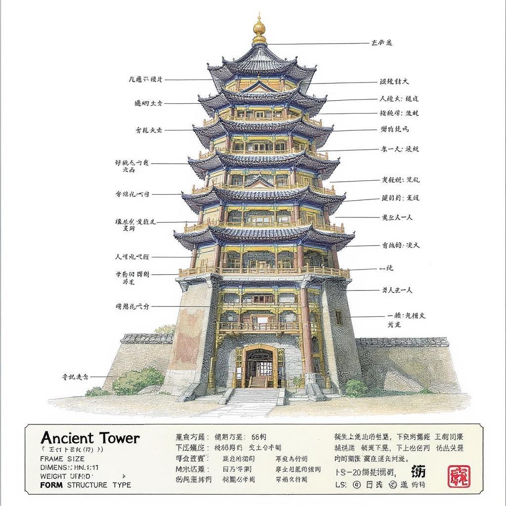 A detailed cross-section of an ancient Chinese tower, presented in a color pencil style with realistic shadows, highlighting its intricate construction techniques and architectural design elements. Each level of the tower is labeled to showcase key features such as rooms, bridges, and architectural details. A text panel at the bottom provides information on the historical significance, along with frame size, dimensions, height, weight, materials used, and form structure type. It also touches on construction technology and user needs, complemented by related drip icons. The artwork is portrayed against a white background and is slightly stylized for artistic effect, maintaining the core concept while introducing small creative modifications.