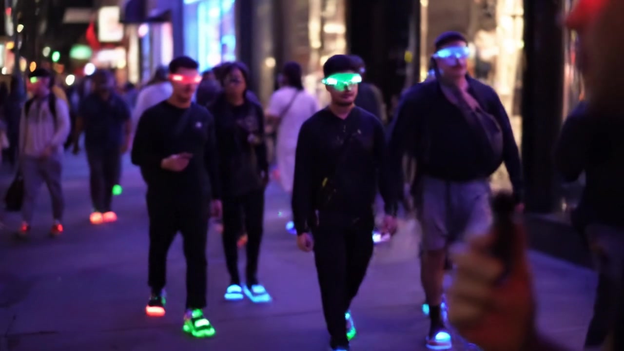 Crowded midtown NYC sidewalk bathed in purple-teal neon glow. Passers-by wear light-up sneakers and AR glasses. A slight phone-style shake. Unbranded mic enters frame as the interviewer asks: