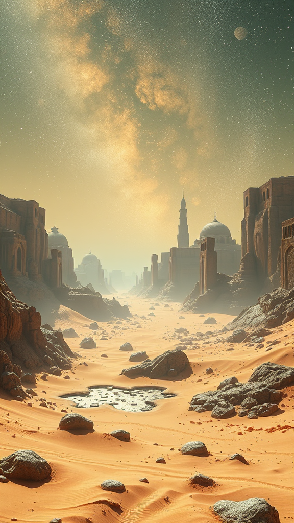 Cryptic Sands Oasis, Abandoned Citadel, Surreal Cosmic Wilderness, Octane Rendering, Maya Unreal Engine, Featured Terrainscape, Vibrant Dust Mural, Fantasy World-Building, 16K Resolution, Instagram Art Nouveau Revelation --no Ruins or Structures