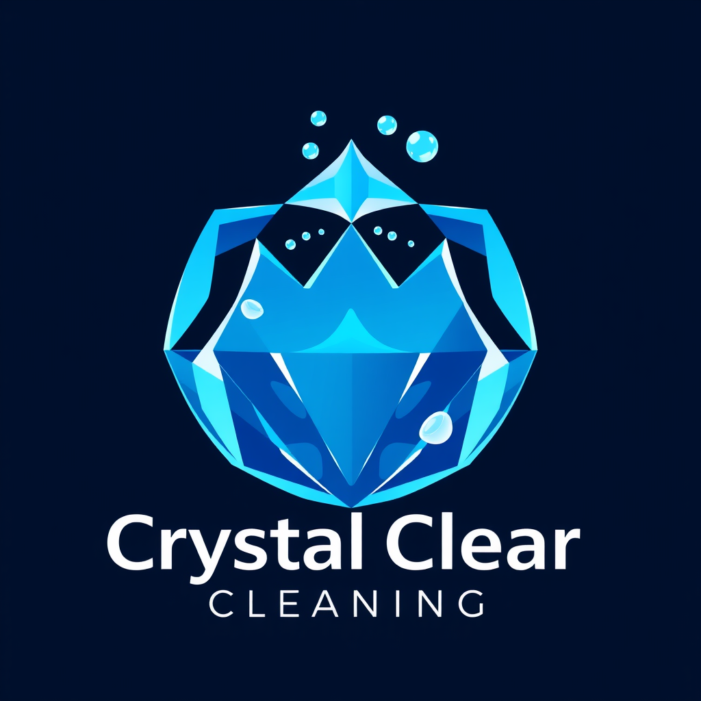 Crystal Clear Cleaning emblem features a stylized sparkling gem with sleek lines, incorporating bubbles and bright blue hues to evoke a sense of purity and freshness, with a modern sans-serif font showcasing the brand name elegantly beneath the design.
