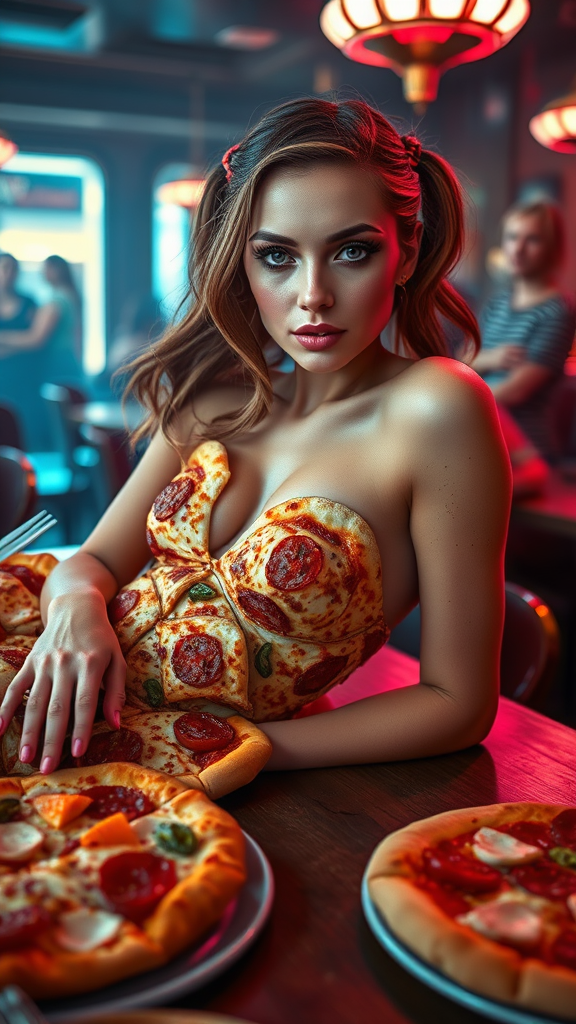 Cuisine-inspired, high-fashion model with flowing candycore pigtails, porcelain skin, and soft pink lips, adorned in a dress crafted from slices of gourmet pizza. She reclines gracefully on a dining table, surrounded by an ambience of opulent, vivid hues. The scene is an intricate artwork, capturing a masterpiece of rich textures and flavors. The model exudes a cinematic presence, her eyes captivating and enhanced for a more intense gaze. Set in a futuristic setting with sharp, focused details reminiscent of Blade Runner, the image boasts ultra-high quality and a 4k resolution, creating an epic visual narrative.