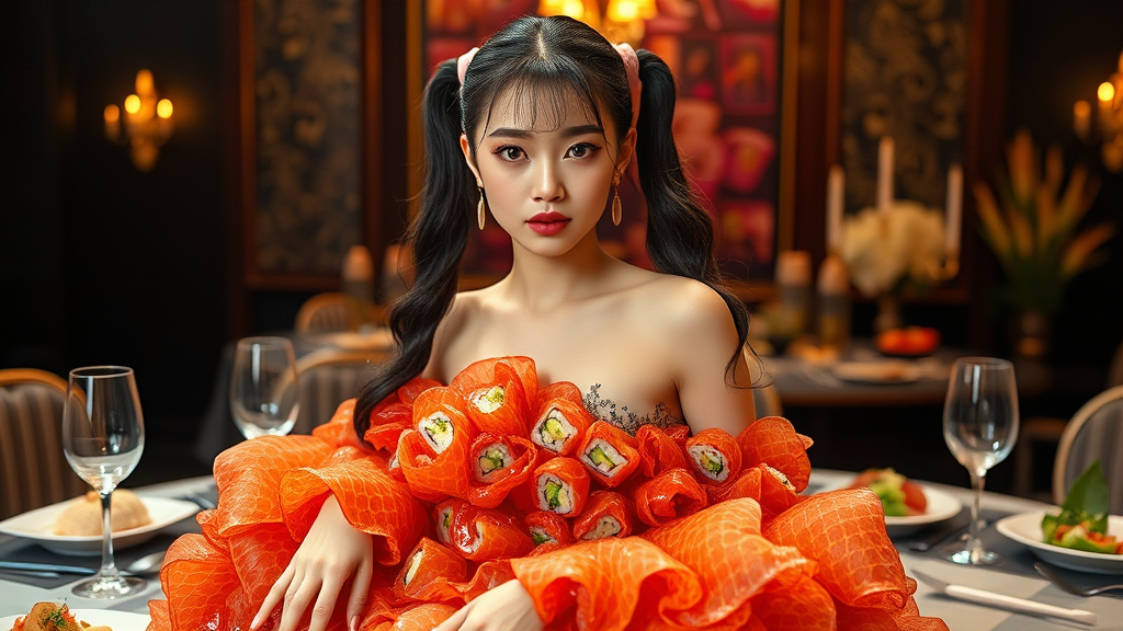 Cuisine-inspired Vogue Runway Model with long candycore style pigtails, porcelain skin, and soft pink lips wearing a dress made of vibrant, realistic sushi. She poses elegantly on a lavish table setting, showcasing rich, deep colors and intricate details. The scene is cinematic, with an ultra high-quality look, capturing her strikingly improved eyes and sharp features in epic, 4k resolution reminiscent of a futuristic landscape.
