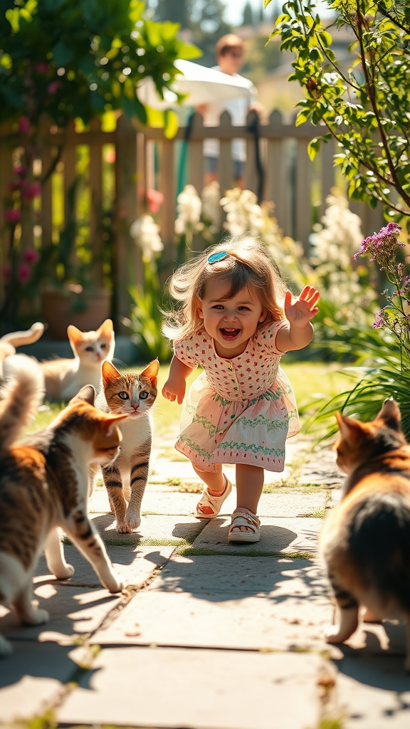 Curious cats and a joyful girl playing in a sunlit garden, surrounded by playful shadows.