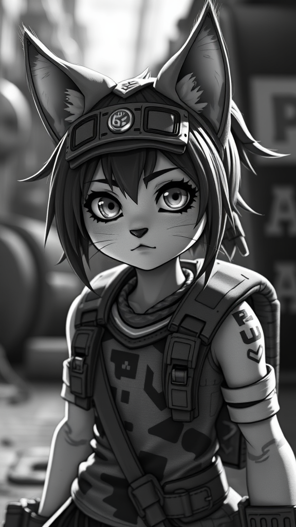 Cute cat girl inspired by the artistic styles of Yoji Shinkawa and Guweiz, envisioned in a Borderlands-like aesthetic. Rendered using Unreal Engine and Octane Render, creating a cinematic feel with depth of field and raytracing in 8K UHD. Captured in monochrome tones, adding a striking contrast. Elements include text, logos, and watermarks set against intentionally cropped compositions. Depicted with a focus on maintaining proper anatomy and proportions to avoid common visual errors such as extra limbs or facial distortions. Utilizing cinematic lighting to highlight character features and surroundings, the image captures a unique blend of artistic influences with a high-quality visual output.