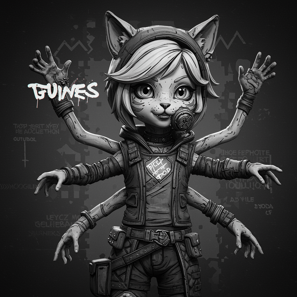 Cute cat girl inspired by Yoji Shinkawa and Guweiz in the style of Borderlands, using Unreal Engine and Octane Render, featuring depth of field, 8k UHD resolution, ray tracing, and cinematic lighting. The image should be monochrome and grayscale with artistic text overlays, experimental logo placement, and intentional distortion to create a unique, edgy aesthetic. The composition includes cropped and out-of-frame elements, embracing a mix of qualities from worst to normal, incorporating low resolution and jpeg artifacts for a stylized effect. The character design is intentionally avant-garde, experimenting with anatomy to include playful mutations like extra limbs, elongated neck, and surreal hands, reflecting an imaginative, post-apocalyptic world.
