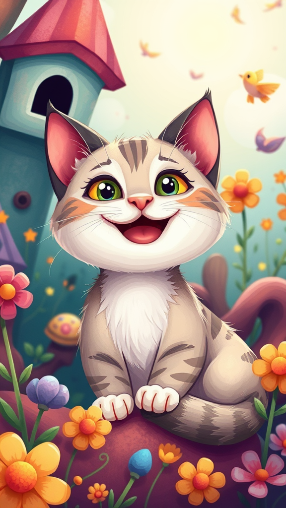 Cute cat illustration for a children's storybook, inspired by the style of Tarsila do Amaral, featuring a whimsical and vibrant setting. The cat has a joyful expression with bright, playful eyes and a charming demeanor, nestled in a colorful, dreamlike environment with exaggerated, imaginative elements. The illustration is rendered in high definition, showcasing intricate details and a vivid color palette that captures the essence of fantasy and wonder. Background elements are harmonious and blend seamlessly with the character, giving a coherent and enchanting visual experience.