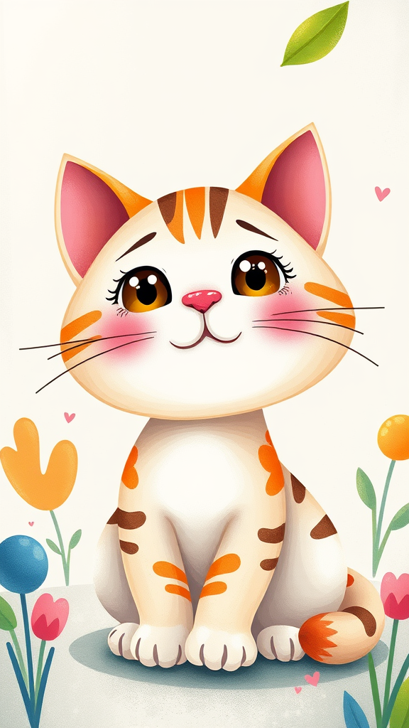 Cute cat illustration for a children's storybook inspired by the style of Tarsila do Amaral, showcasing vibrant colors and whimsical shapes, 8K resolution, detailed and captivating design, emphasizing the playful and imaginative nature of the character, avoiding any distortions or imperfections for a charming and endearing appeal, ensuring clarity and focus within the frame.