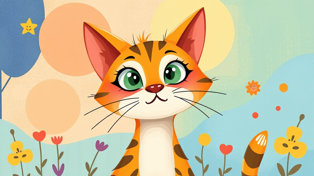 Cute cat illustration for a storybook for kids in the style of Tarsila do Amaral, featuring vibrant colors and playful shapes, UHD, HDR, 8K resolution. The cat has exaggerated features for a whimsical effect, including a long neck and expressive eyes, set in a lively and imaginative backdrop. The design is seamless, with no distortions or errors, maintaining clarity and quality throughout.
