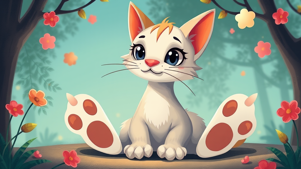 Cute cat illustration for a storybook for kids in the style of Tarsila do Amaral, featuring vibrant colors and a playful atmosphere, UHD, HDR, 8K quality, depicting a whimsical and imaginative feline character with unique features, oversized paws, expressive eyes, and a charmingly exaggerated long neck, ensuring a delightful and engaging appearance, avoiding low resolution, out-of-frame elements, and unnecessary artifacts or text, maintaining focus on the enchanting and fantastical essence of a children's tale.