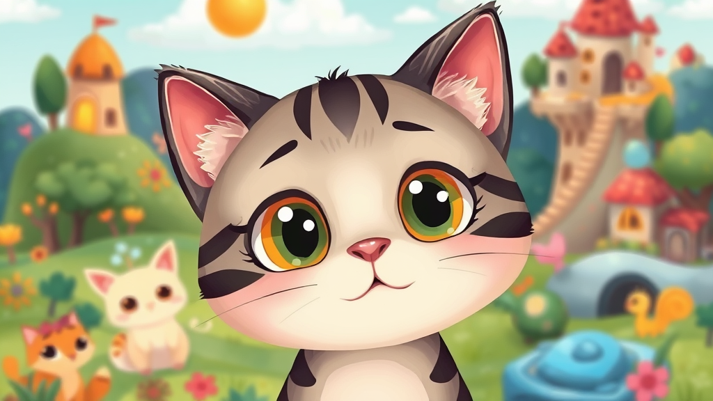 Cute cat illustration for a storybook for kids, inspired by the style of Tarsila do Amaral, with vibrant colors and playful elements, UHD, HDR, 8K, featuring a whimsical and imaginative scene. The cat has a charming and unique appearance with large, expressive eyes that capture its curious nature. The background is filled with fantastical landscapes and friendly creatures to spark imagination. The art is clean and crisp, ensuring each detail is beautifully rendered, fitting for the magical world of children's tales.