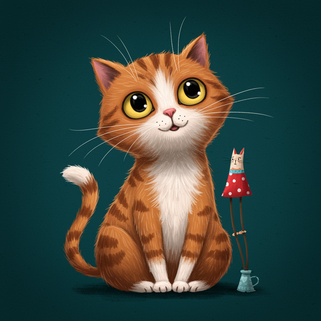 cute cat illustration for storybook for kids style of Tarsila do Amaral, UHD, HDR, 8K, charming, whimsical, playful, vivid colors, imaginative, enchanting, captivating, delightful expressions, endearing character, artistic, appealing features, harmonious composition, creative interpretation, lively spirit, engaging visual, storytelling essence
