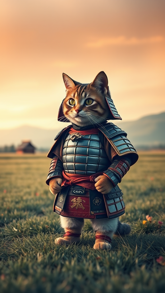 Cute cat in traditional samurai armor standing proudly in a vast open field. The scene captures an analog style with highly detailed elements, evoking the charm of an award-winning image. The samurai cat is depicted flawlessly, avoiding common pitfalls like missing or extra digits, and maintaining anatomical accuracy. The landscape and elements are crisp and clear, avoiding any artifacts such as blurriness, tiling, or unwanted marks. The composition is well-framed, balanced, and free from any distracting imperfections, allowing the noble presence of the cat samurai to shine through.
