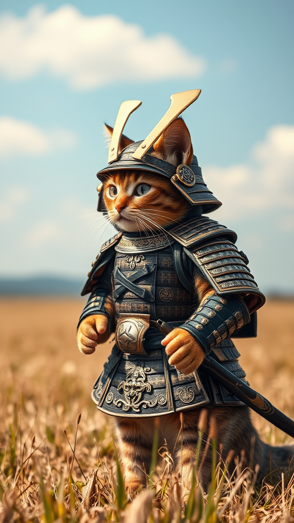 Cute cat wearing intricate samurai armor stands in an expansive field under a clear sky, embodying the spirit of a warrior. The scene is highly detailed, capturing the elegance of traditional armor. The image is smooth and evokes an analog style, reminiscent of award-winning artwork. Despite possessing the charm of low-resolution photography, the composition remains engaging and expressive. While imperfections like missing or extra digits are part of its character, they add a unique touch to the feline samurai. Some elements may appear slightly cropped or off-frame, but the overall aesthetic remains captivating, blending the allure of classic style with a whimsical, otherworldly charm.