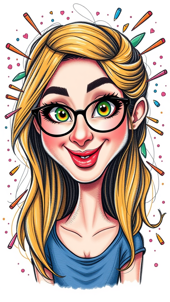 Cute mid-20's woman caricature pencil drawing, color pencils, Pixar-style, humorously exaggerated features, vibrant, white background, high chaos, tall aspect ratio, stylistically playful and whimsical.