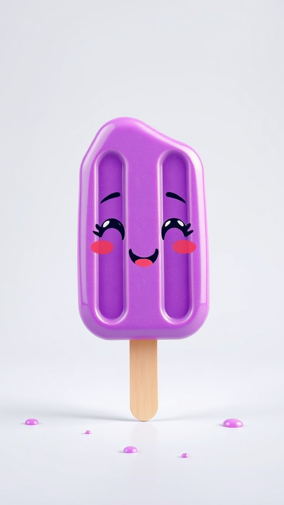 Cute popsicle character from mobile game, hyper realistic octane render, 5k resolution, with a toon style, vibrant purple hues, playful and whimsical expression, slightly melting edges to emphasize texture, glossy surface with subtle reflections, set against a light and cheerful background to highlight its charm.