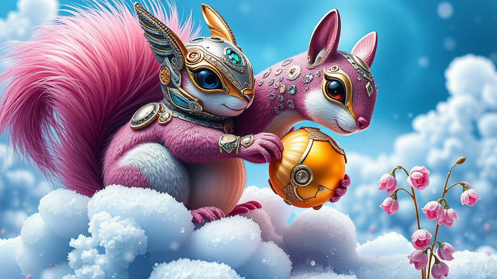 Cyber Bling masterpiece from the 'art of control' series by Jasper Harvey, inspired by futuristic optics, featuring intricate silver and gold details, expressive facial features, and swirling vortexes. Envision whimsical cyborg creations, crafted from shimmering crystals, perched on a dreamy blue cloud. A plump squirrel with vibrant pink fur clutches a resplendent golden acorn, which tumbles from her grasp into a pristine white clearing, sprinkled with delicate pink snowdrops. This vision captures the raw essence of innovation and fantasy.