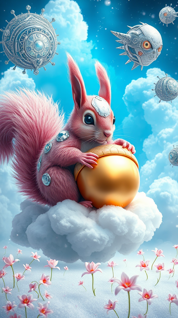 Cyber Bling masterpiece inspired by 'art of control' collection by jasper harvey, embracing futuristic optics with a blend of silver and gold, intricate facial features, swirling vortexes, and 3D whimsical cyborgs crafted from shimmering crystals atop a luminescent blue cloud. Perched on the cloud is a chubby squirrel with fluffy pink fur, delicately releasing a massive golden acorn cascading towards a pristine white clearing, sprinkled with delicate pink snowdrops—style raw—s 900.