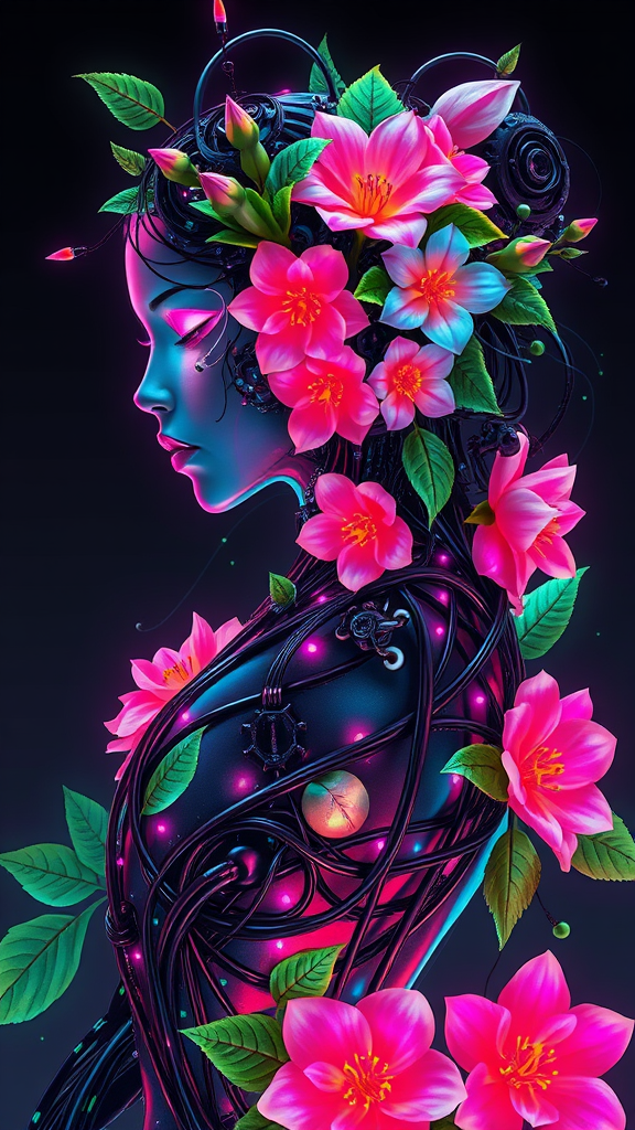 cybernetic floral punk woman, intricately designed with biomechanical plant elements, vibrant neon hues weaving through dark metallic structures, a fusion of organic and synthetic beauty, radiating resilience and fierce independence, elongated silhouette with floral motifs intertwined with digital circuitry, sharp yet graceful features illuminated by iridescent light, emphasizing a balance between nature and technology.