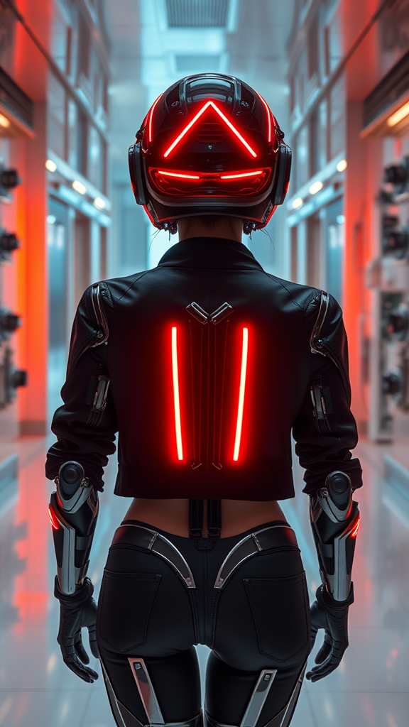 Cybernetic girl roams sterile lab's gleaming tile floor, surrounded by humming machinery that reflect off her sleek black Techwear jacket. Her face is concealed behind a futuristic cybernetic helmet, featuring vibrant red LED lights that form a striking triangular pattern, resembling a halo around her head. The LED lights seamlessly integrate with her eye sockets, creating an ethereal glow. Her helmet's curves and ridges evoke a sense of fluidity, as if it's been grown from her own skin. The jacket itself is cropped, exposing her exposed mechanical limbs, including her elbow joint and knee, where precision-engineered metal plates seamlessly integrate with her natural limbs. A duo of metallic ribs run down her back, connecting at the hemline of her jacket, showcasing the melding of organic and synthetic flesh. Delicate fiber-optic strands weave in and out of her helmet, pulsating with a soft blue light that underscores the bond between her human physiology and advanced technology.