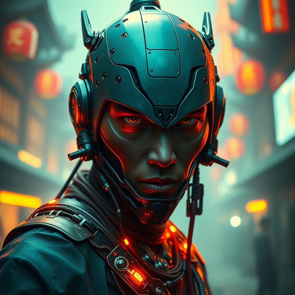 Cybernetic monk in futuristic China, captivating anatomy:1.1, moody lighting, surreal, breathtaking, theatrical, finished masterpiece, high resolution HQ:1.1, vibrant hues, 16k resolution, UHD, HDR10, intricately detailed eyes, full figure, set in a cyberpunk landscape, --ar 16:9 --q 2 --v 5