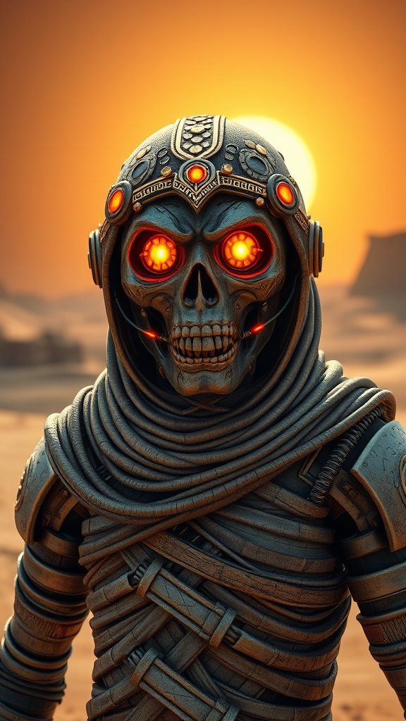 Cybernetic mummy with detailed mechanical components and radiant amber eyes, exuding an ominous aura, encased in ancient bandages, adorned with a gilded headdress, set against a sun-drenched desert landscape, rendered in high-quality 3D using Unreal Engine 4, featuring dramatic and cinematic lighting.