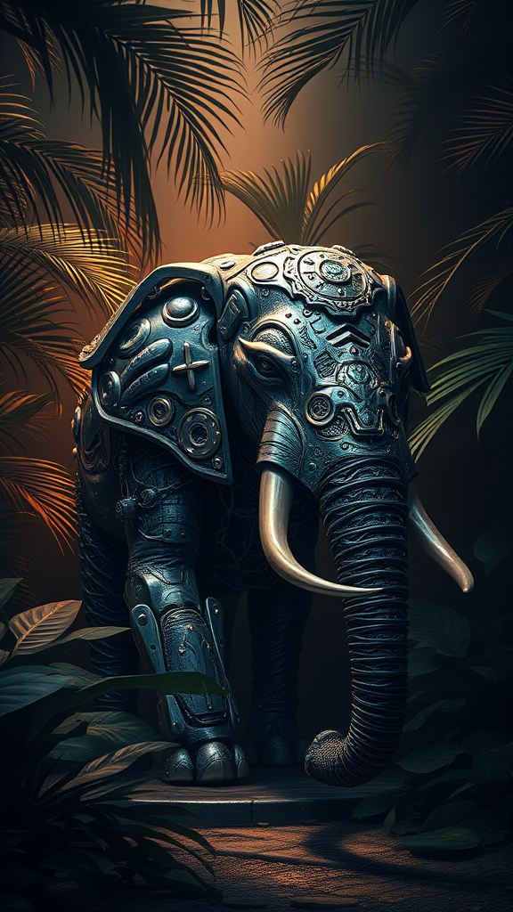 Cybernetic pachyderm clad in futuristic battle armor amidst a lush, shadow-dappled tropical jungle, illuminated with dramatic interplay of light and dark, featuring intricate carved patterns that reveal layers of metallic sophistication.