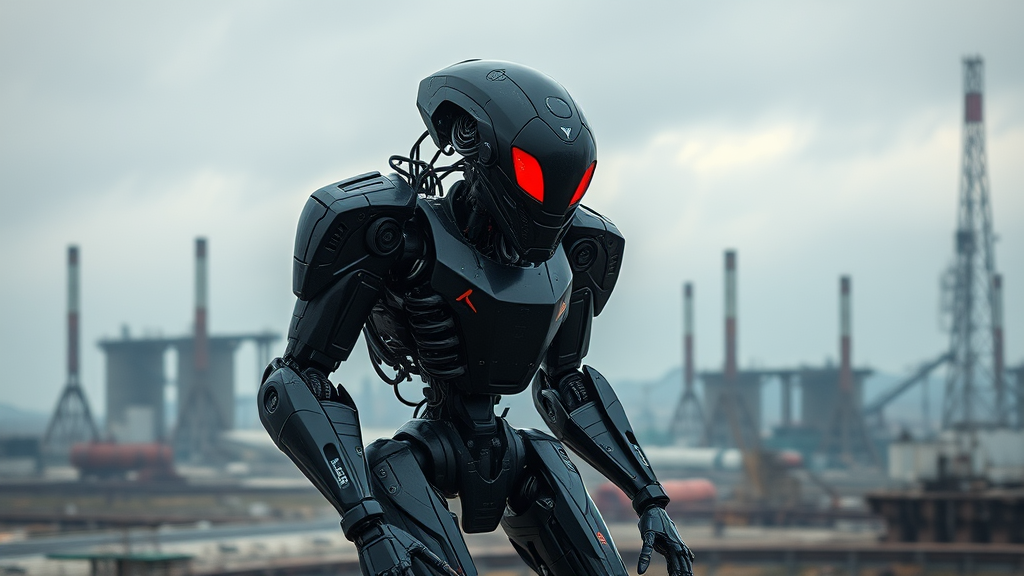 Cybernetic sentinel with lacquered obsidian skin and piercing crimson optics emits a low hum as it patrols the desolate industrial landscape, its mechanical limbs etched with a subtle, circuit-like scarring that seems almost... organic.