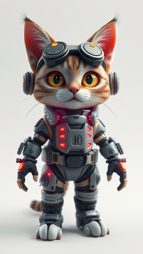 Cyberpunk adorable feline engineer, advanced and intricately detailed, crafted using Blender and Unreal Engine, featuring volumetric illumination, set against a minimalistic white backdrop, with subtle creative twists maintaining the essence of the original concept.