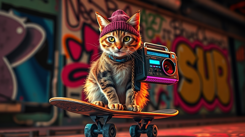 Cyberpunk aesthetic, a cat perched on a skateboard, wearing a tilted beanie and carrying a futuristic boombox slung over its shoulder, exuding confidence, bold and bright color palette, urban graffiti backdrop, dynamic and edgy ambiance, whimsical vibe, detailed artistry, expert composition, expansive view, 8K clarity, rendered in Octane with advanced ray tracing and HDR10 settings.