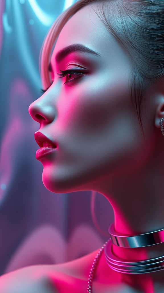 Cyberpunk aesthetic, graphic design with pink electronic hues, side view of a girl's pretty and cute face, adorned with a sleek silver necklace, against a metallic silver background, her lips gleaming, porcelain skin.