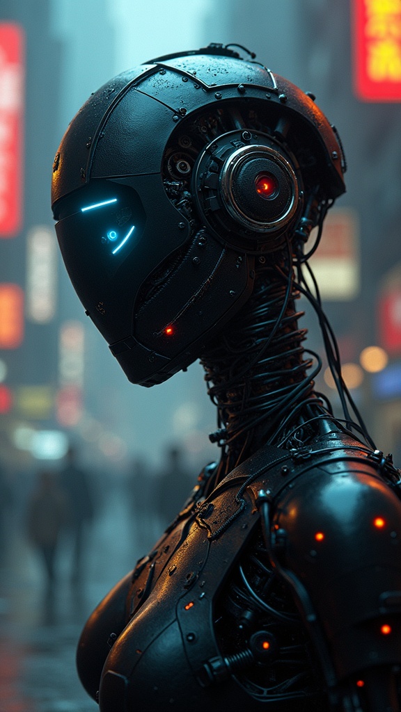 cyberpunk android reflecting on end times in a steampunk setting, cinematic depth and intense focus, rendered with octane-style realism, detailed enough to serve as a high-quality videogame asset, composition guided by the golden ratio, captured through a wide-angle lens, featuring intricate circuitry and gears, set against a neon-lit urban backdrop, with a mood of technological melancholy