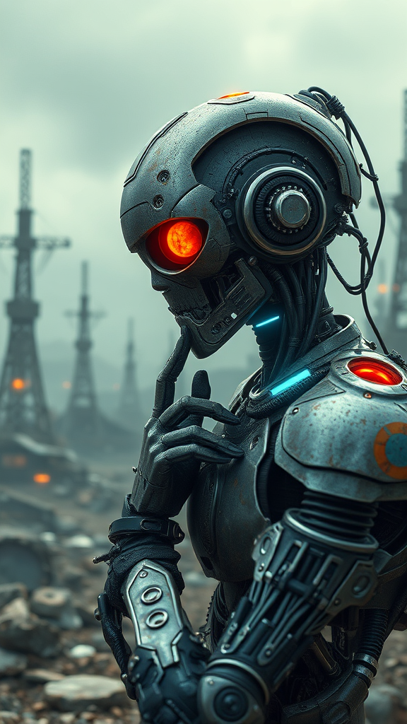 Cyberpunk android deep in thought amidst a post-apocalyptic landscape, infused with steampunk elements, presented with cinematic focus and octane render quality, designed as a high-definition video game asset. The composition is harmonized by the golden ratio, captured through a wide-angle lens, showcasing intricate mechanical details and a futuristic atmosphere.