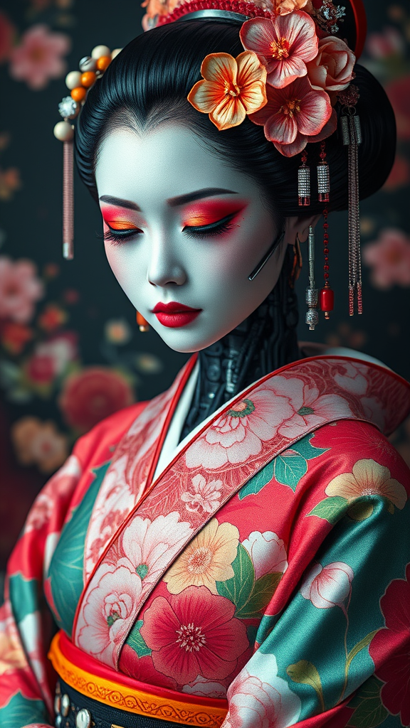 Cyberpunk android geisha adorned in a vibrant floral kimono, her expression melancholy yet serene, captured in a hypermaximalist style; the intricate design features an explosion of colors and textures, embodying an elegance that is both futuristic and traditional. Every minute detail is meticulously highlighted, from the delicate patterns on her attire to the complex circuitry subtly visible beneath her skin. This photorealistic portrait, shot on a 70mm lens, invites a deep exploration of emotion and craftsmanship, merging the boundaries between human and machine in a rich visual tapestry.