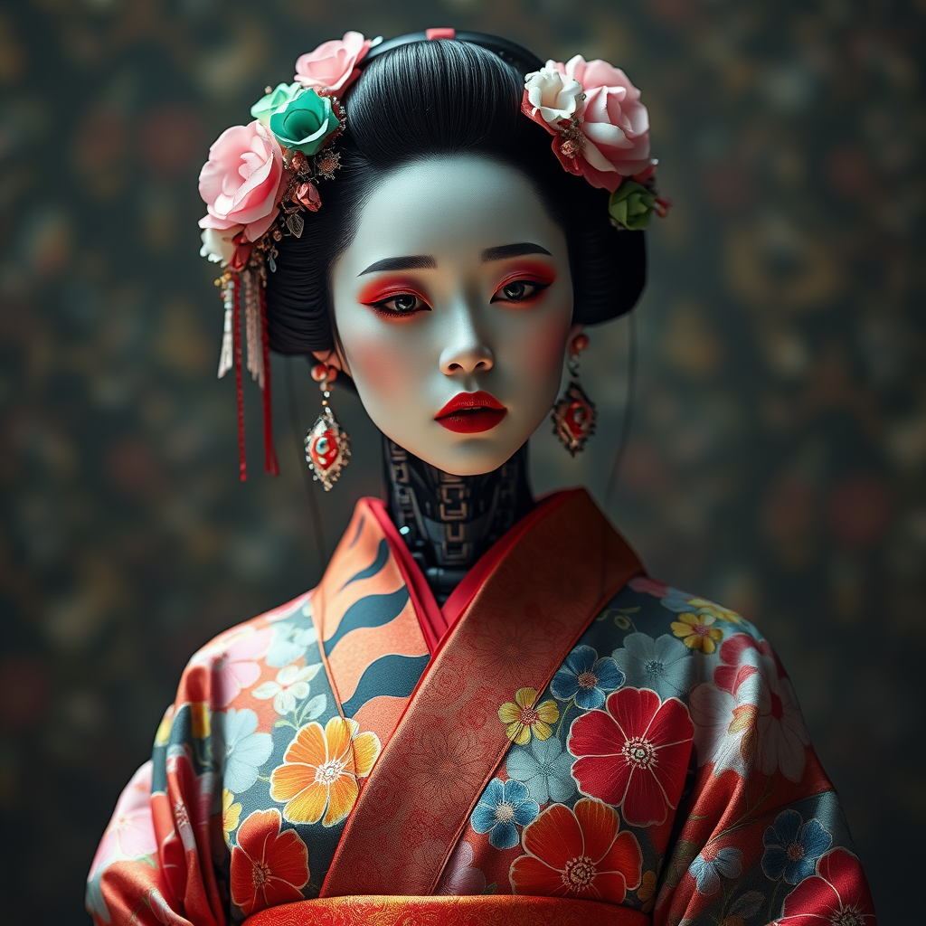 Cyberpunk android geisha in a vibrant floral kimono, exuding a melancholic expression, features an ultra-maximalist design with breathtaking elegance. The scene is captured in hyper-realistic detail, with intricate patterns and textures woven into every inch of her attire and synthetic skin. A kaleidoscope of colors dances across her attire, enhancing the futuristic yet traditional aesthetic. Photographed with a 70mm lens for a cinematic feel, the image captures the fusion of technology and timeless beauty in exquisite detail.
