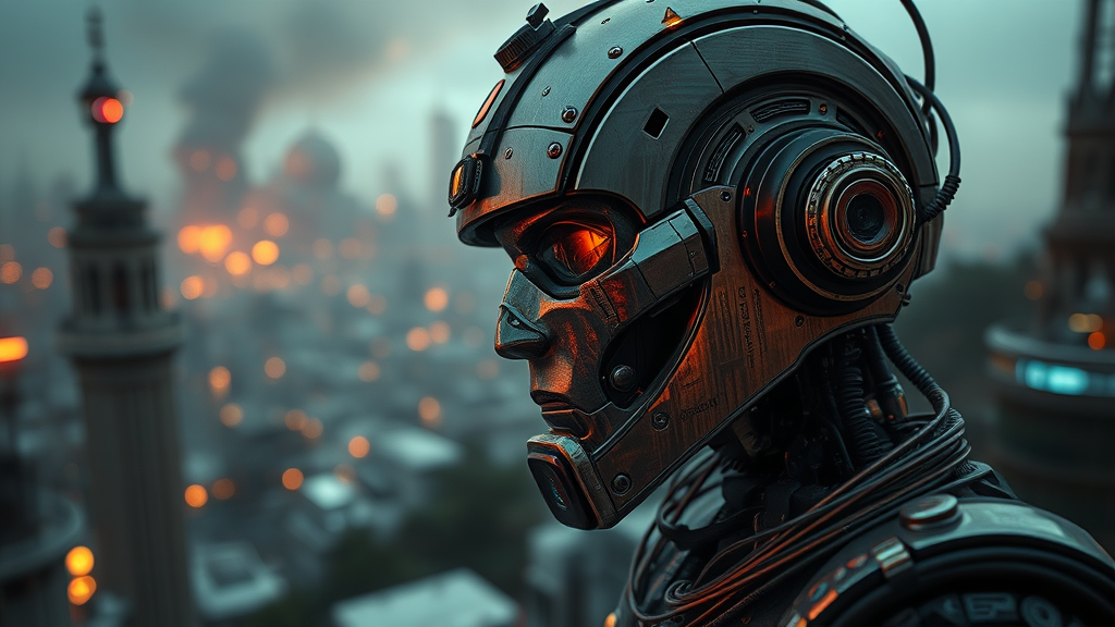 Cyberpunk android in deep contemplation of a dystopian apocalypse, infused with steampunk elements, captured in a cinematic focus. Rendered in a hyper-realistic octane style, reminiscent of a high-end videogame asset. The composition follows the golden ratio, with a wide-angle perspective that emphasizes the depth and detail of the scene. Subtle neon highlights contrast with brass and copper textures, evoking a sense of both futuristic and vintage design. The android's gaze is distant, reflecting both its mechanical complexity and the impending chaos.